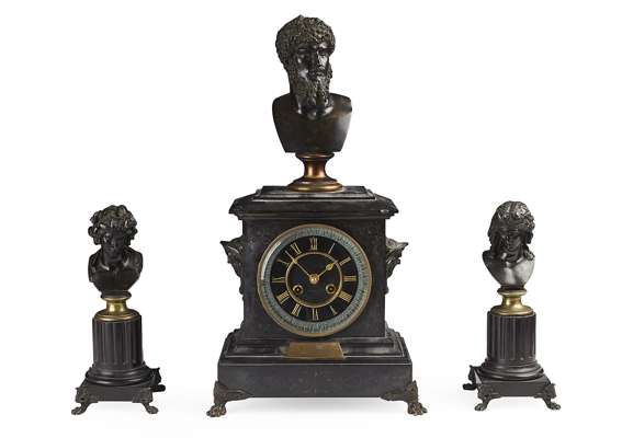 VICTORIAN BLACK SLATE AND BRONZE CLOCK GARNITURE