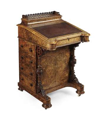 VICTORIAN BURR WALNUT, MAHOGANY AND BIRCH DAVENPORT