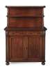 the three quarter pierced brass gallery over two open shelves raised on lappet carved columns, above a pair of short frieze drawers and a pair of cupboard doors, raised on lobed bun feet