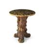 the circular top raised on a realistically modelled stump-form pedestal base, in mottled green, blue, yellow and brown glazes