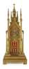the central spire surmounted by a cross and flanked by four crocketted spires above a Gothic tracery dial, the pierced doorway fitted with red glass, on a stepped base