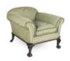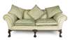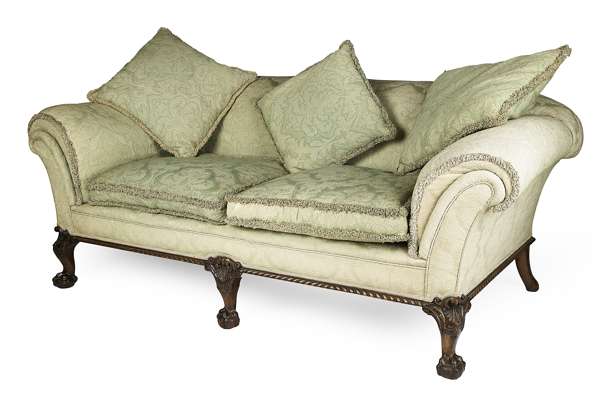 comprising a sofa and an easy chair, covered in green foliate patterned fabric with tassle edging, raised on shell carved cabriole legs united by a gadrooned apron and ending in claw and ball feet (2)