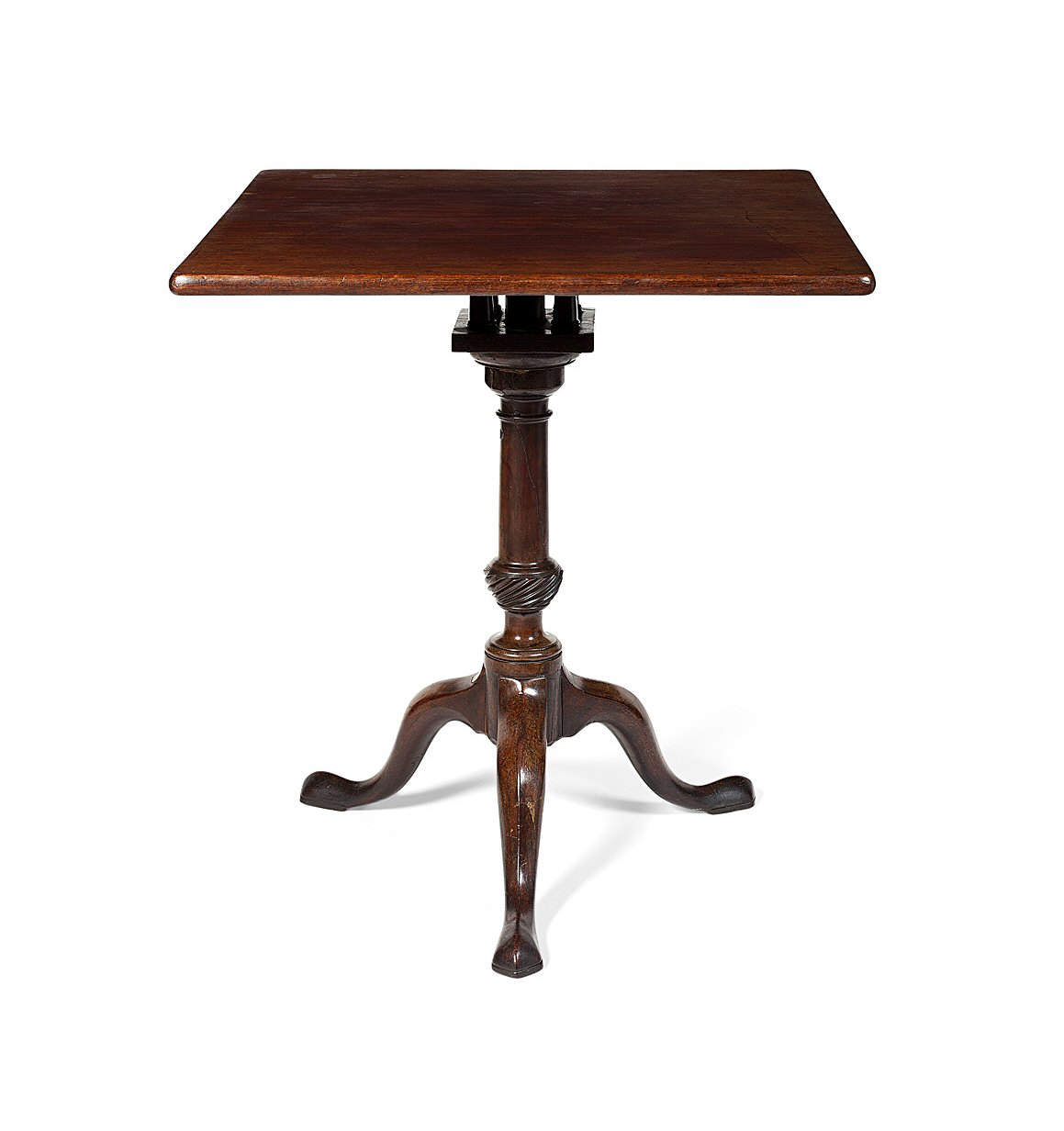 the squared tilt top over a birdcage and raised on a baluster turned column and cabriole legs ending on pointed slipper feet