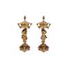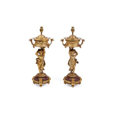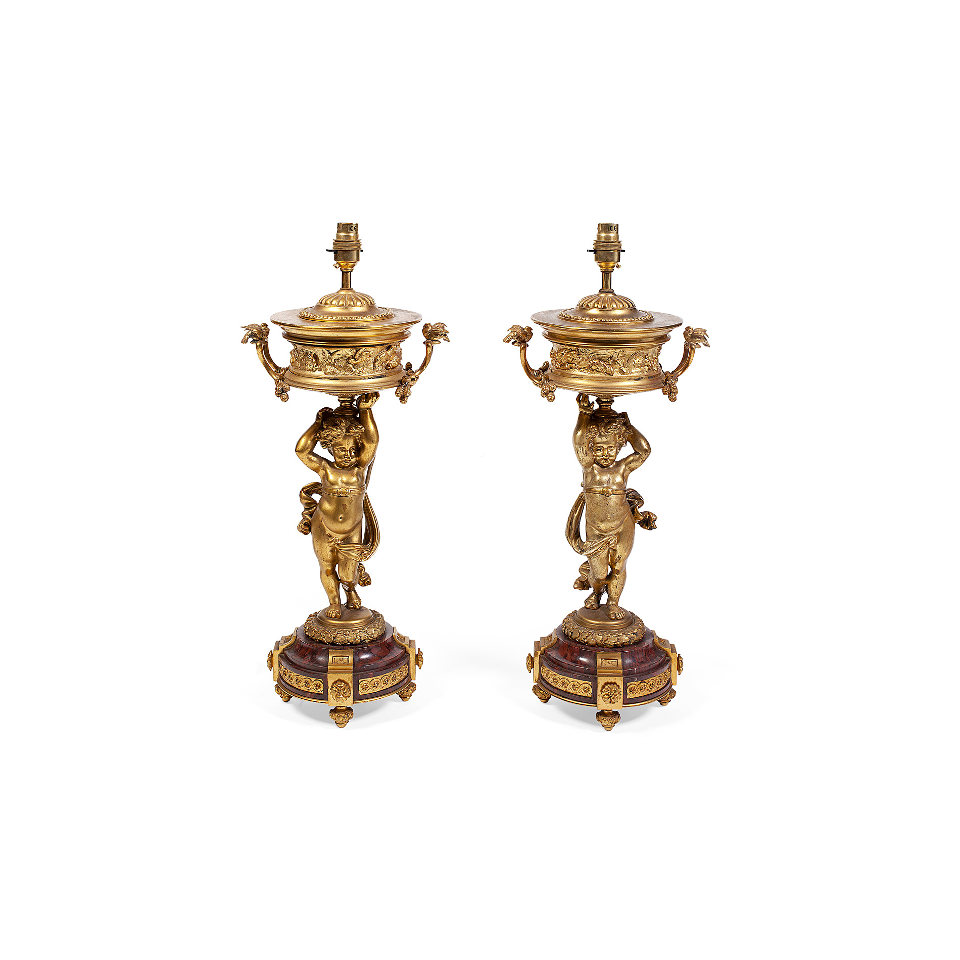 formed as cherubs holding aloft a campana shaped urn, raised on rouge marble base, with toupie feet, fitted for electricity (2)