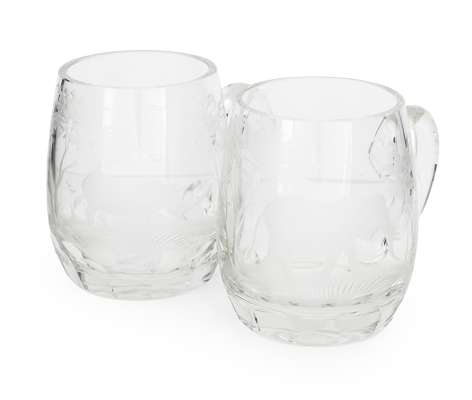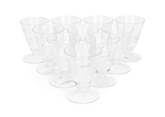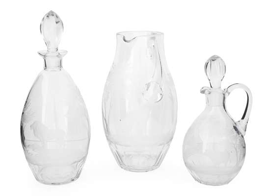 comprising ten wine glasses, nine champagne glasses, ten liqueur glasses, two mugs, a pitcher, a decanter and a ewer; each piece engraved with an image of a big game animal including lions, rhinoceros, giraffes, gazelles, water buffalos and elephants, acid etched mark 'Rowland Ward/ Nairobi Kenya' (34)
