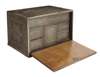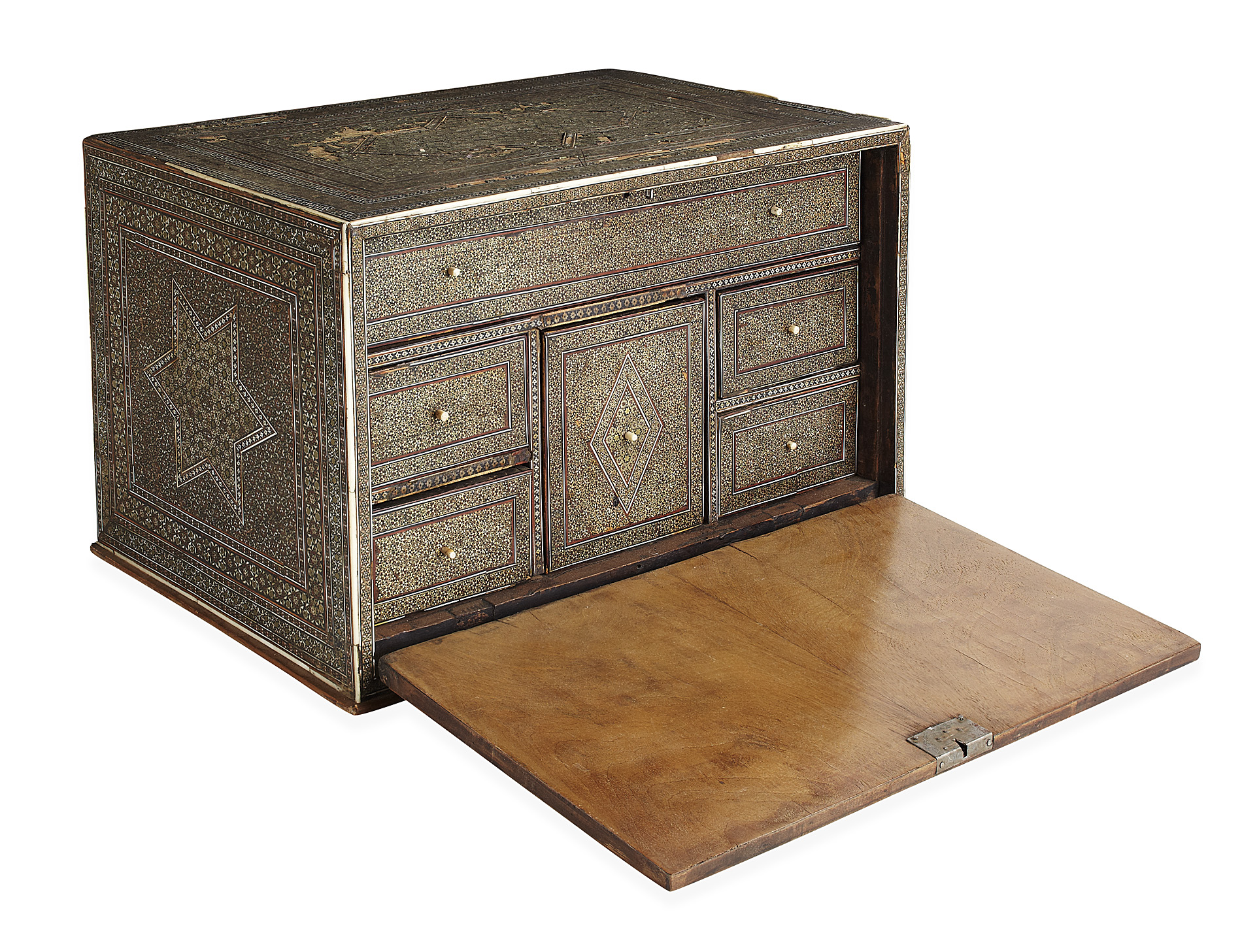 inlaid throughout with geometric designs, the fall opening to reveal a fitted interior with an arrangement of six drawers