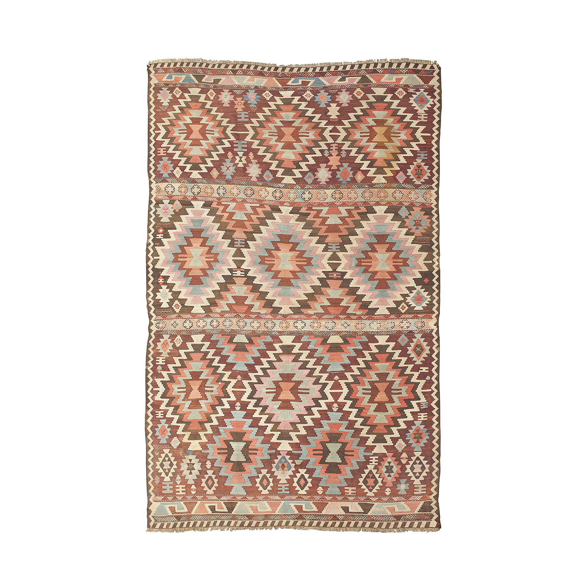 the field with three panels of polychrome serrated lozenges, seperated by flatweave bands, with narrow border strips to each end