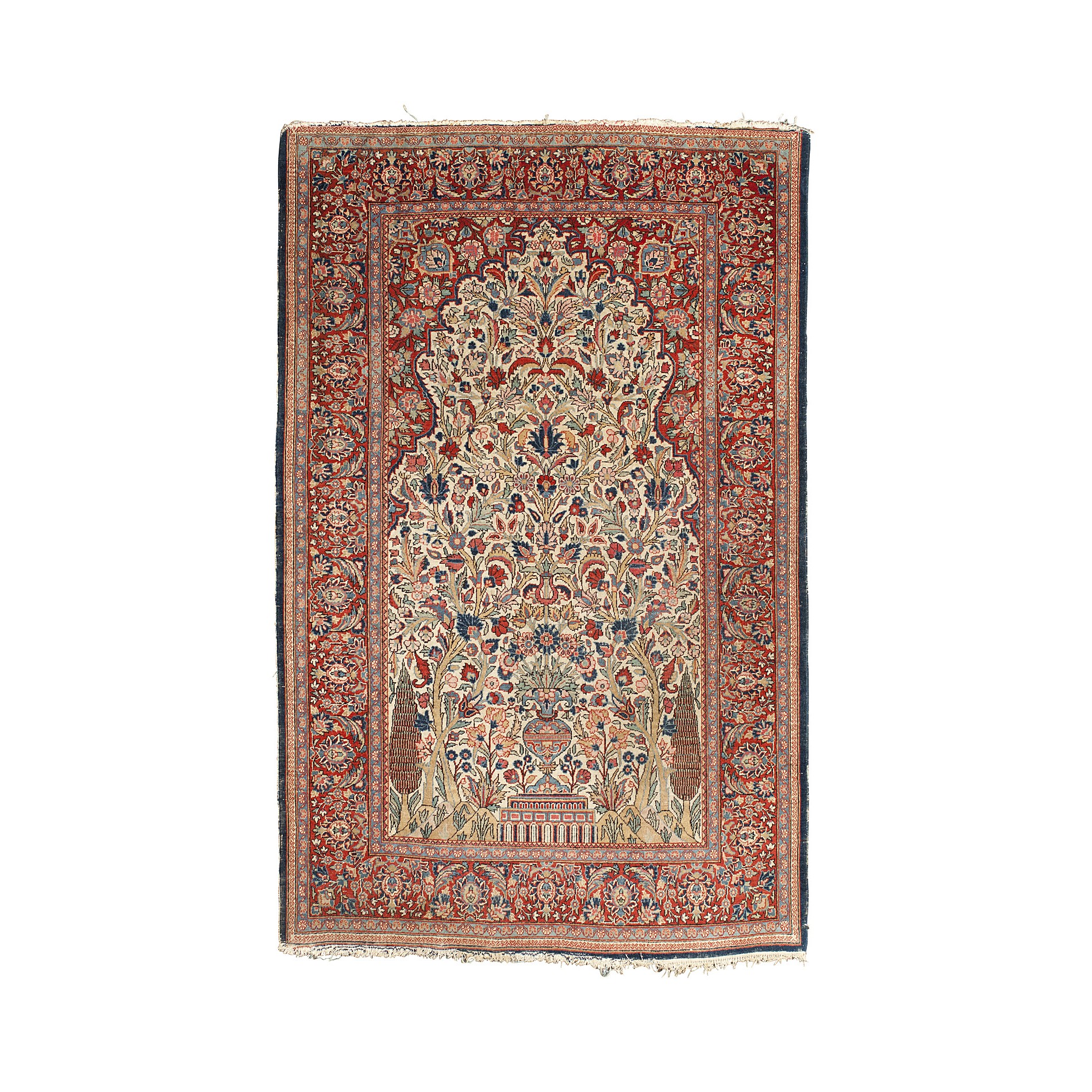 the cream field with foliate vase flanked by trees, red spandrels, within red palmette and foliate vine border between bands