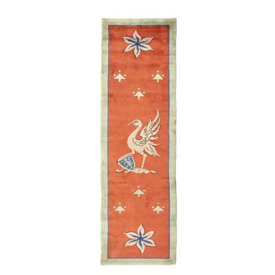 comprising: a pair, each with plain red field centred by a heraldic bird and shield, flanked by flowerheads and arrows, within plain green border; and another smaller, of plainer design (3)