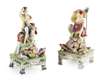 each standing beside a dolphin on a shell-encrusted rocky mound, the inscribed square table base moulded with floral garlands above bracket feet