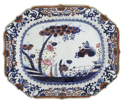 shaped oval form with a serpentine rim, decorated in underglaze blue and polychrome enamels depicting a pair of hoho birds, chrysanthemum, peonies, and bamboo shoots (2)