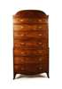the curved arch pediment with line inlay over two short and three long graduated drawers; the lower part with three further long graduated drawers, raised on splay feet