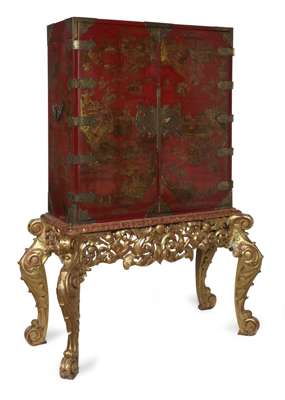 GEORGE II STYLE RED LACQUER CABINET ON STAND