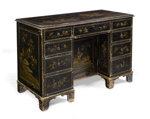 GEORGE III BLACK JAPANNED AND GILT KNEEHOLE DESK