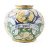 the globular body with a narrow short flaring rim painted in blue, yellow, orange, green, brown and purple, in the upper centre a circular medallion with the profile of a helmeted man on a yellow ground with the inscription 'ORTENSA' on a ribbon behind, the inscription 'ELL DUCIS :' (Elettuario Dulcis - sweet-tasting electuary) on a scrolling and unfurled banner on a ground of compartmentalised decoration, 'a trofei', infilled with armorial and musical trophies on a dark blue, dark green or ochre ground