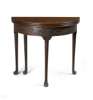 the demilune top opening to a plain top and again to a playing surface, the baize now lacking, carved with foliate scrolls and gaming wells, above a deep frieze carved with foliate scrolls, raised on straight cabriole legs ending in pad feet carved wtih dragon masks and ruyi