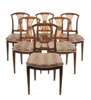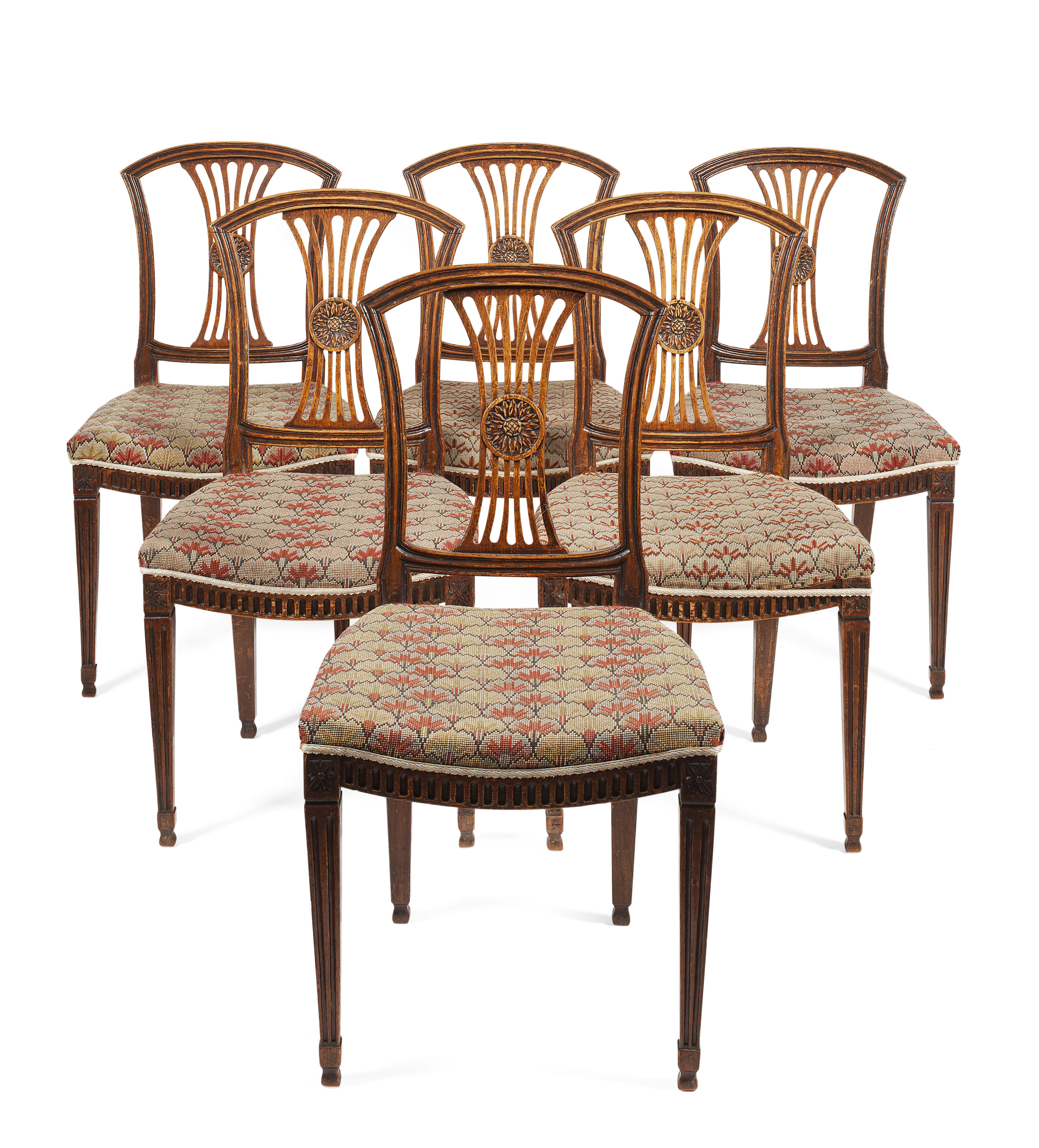 the curved crest rail over a gathered pierced splat centred by a sunflower carved roundel, above stuffover seats in needlework upholstery and a fluted seat rail, raised on square tapered and fluted legs ending on waisted feet (6)