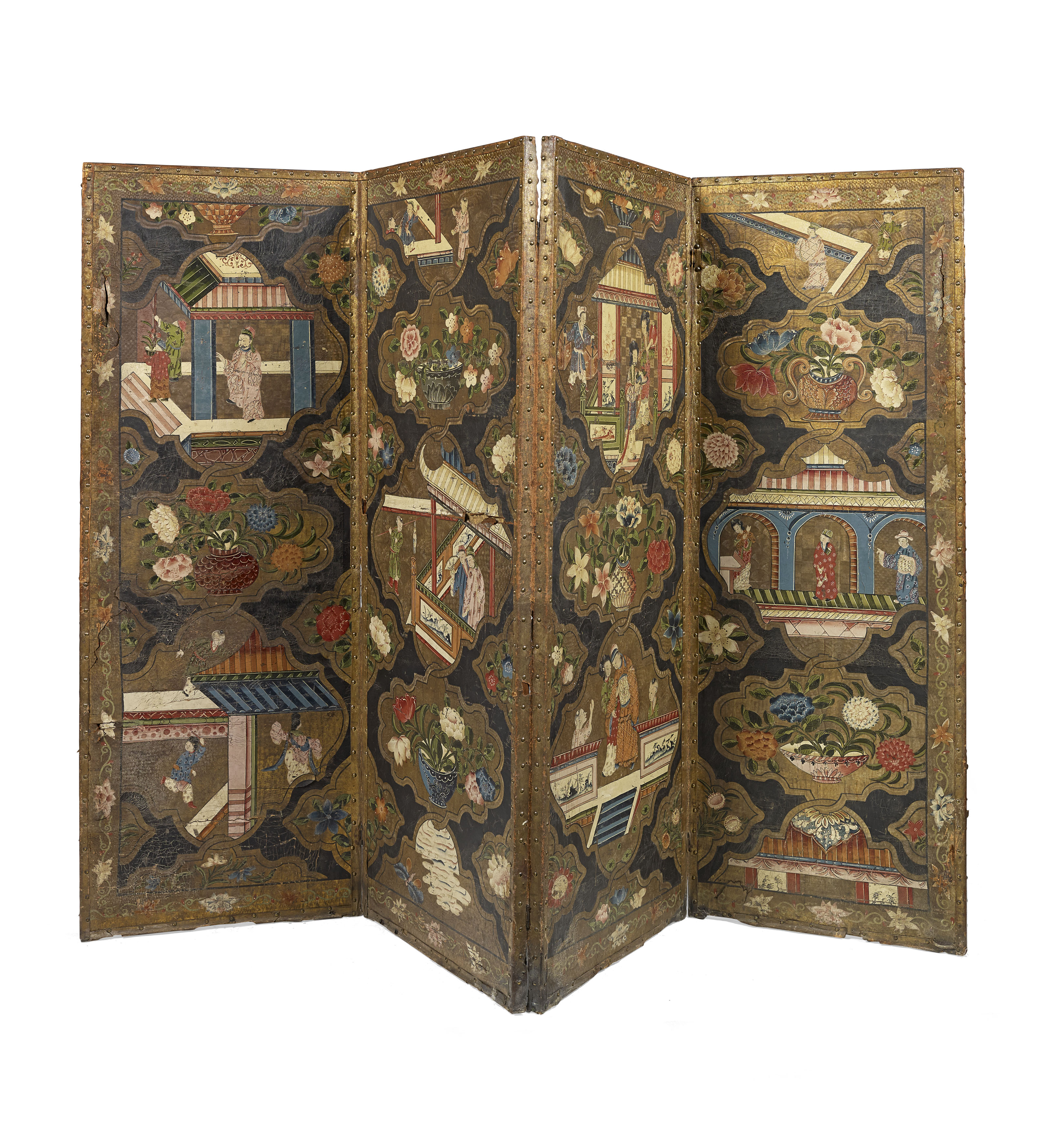 REGENCY POLYCHROMED LEATHER FOUR PANEL SCREEN