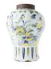 A smaller but similarly shaped baluster vase dated 1678 is in the Gemeentemuseum Den Haag. See D. F. Lunsingh Scheurleer, Delft : Niederlandische fayence , Klinkhardt & Biermann, 1984,cat. 171. A faceted double gourd jar with a similar foot, painted in the same colours, is in the V&A reserve collections (C466.1927) and attributed to Delft 1660-1680.