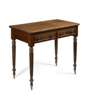 the rounded rectangular top with a sliding centre section reversing to a games board, the interior with an inlaid backgammon board, above a pair of short frieze drawers with two dummy drawers opposing, raised on tapered reeded legs ending in brass caps and castors