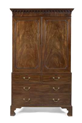 the moulded cornice over a frieze with pointed arch mouldings above a pair of moulded cupboard doors opening to an interior fitted for hanging, the lower part with two short and two long drawers raised on bracket feet