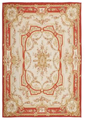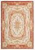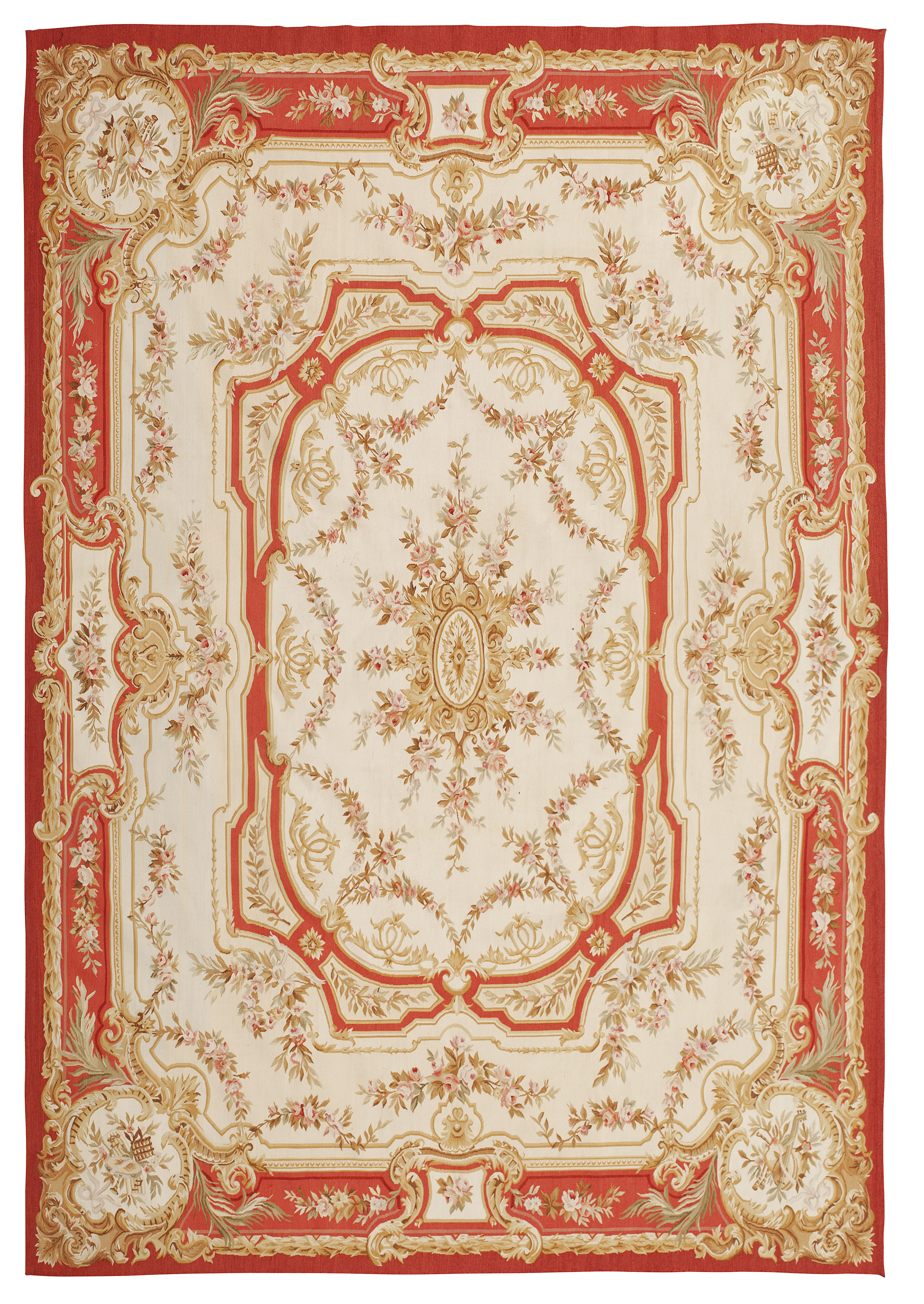 the cream field with central salmon pink framed panel with gold acanthus medallion, within salmon pink foliate border