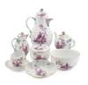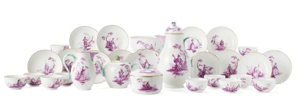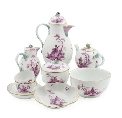 painted in puce with figures of ladies and courtiers in pastoral scenes, with pale green painted handles, comprising a teapot, coffee pot and hot water pot with bud finials, a covered sugar bowl with bud finial, a waste bowl, a shaped side plate, and eleven cups and twelve saucers (29)