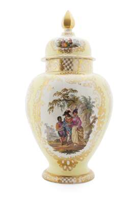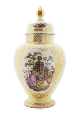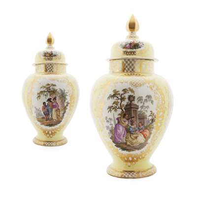 of baluster form, the domed cover with a pointed gilt finial, the bodies with reserves painted with 'deutsche blumen' and fetes galant against a yellow ground, blue Augustus Rex mark (2)