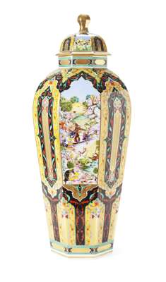 of tall octagonal baluster shape, the side panels richly decorated with scenes of Persian figures in gardens, palaces and hunting deer, against a yellow and black ground with gilt highlights, blue printed mark, number 31 from an edition of 49, signed by the artist; with a certificate scroll