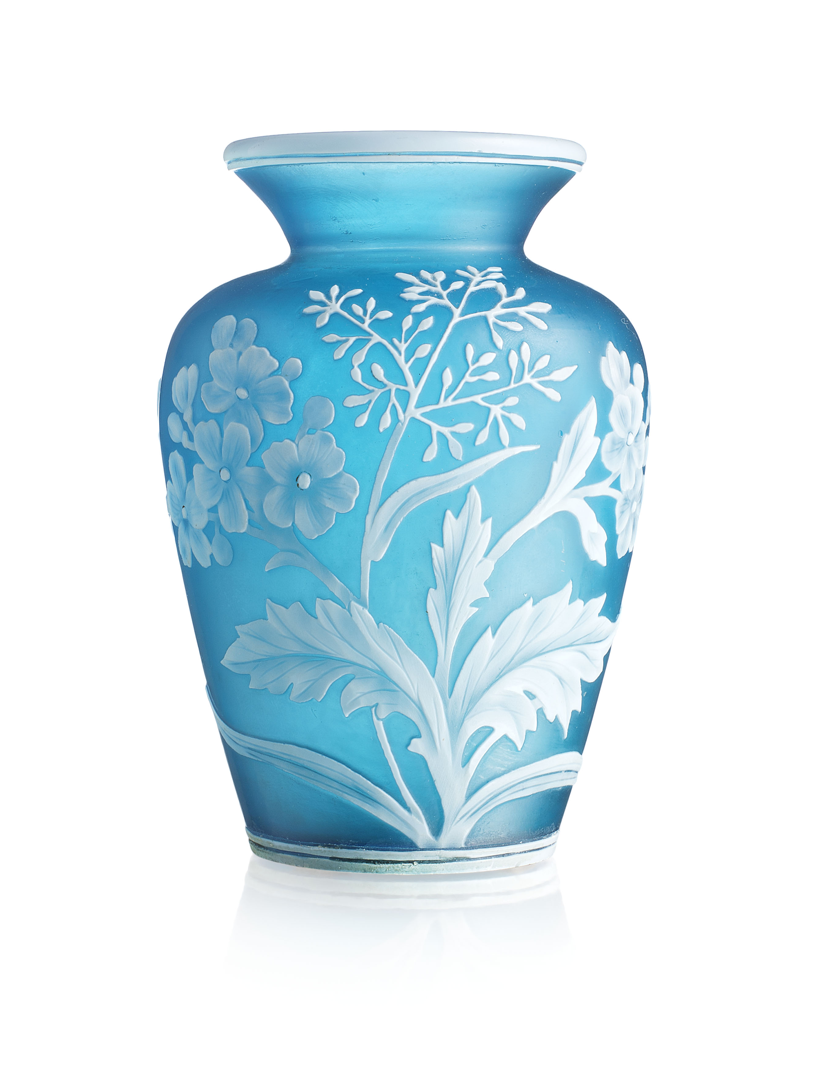baluster form with white overlay depicting flowering branches and leaves against a blue ground, with white bands to the mouth and foot rims