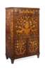 the rectangular top with outset canted corners above a frieze drawer, the fall front opening to a fitted interior; above a pair of cupboard doors, the whole in floral marquetry with birds, lizards, and figures, raised on square tapered feet