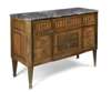 LOUIS XVI STYLE KINGWOOD, TULIPWOOD AND PARQUETRY MARBLE TOP COMMODE