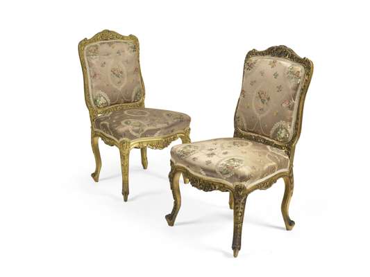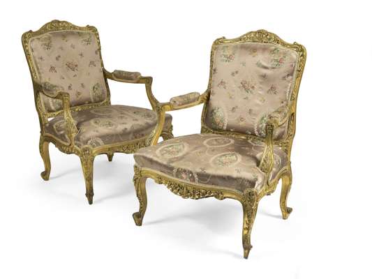 comprising a settee, a pair of armchairs, and a pair of side chairs, with foliate and C-scroll carved giltwood frames, raised on cabriole legs ending in raised scrolled feet, upholstered in floral embroidered cafe au lait silk (5)