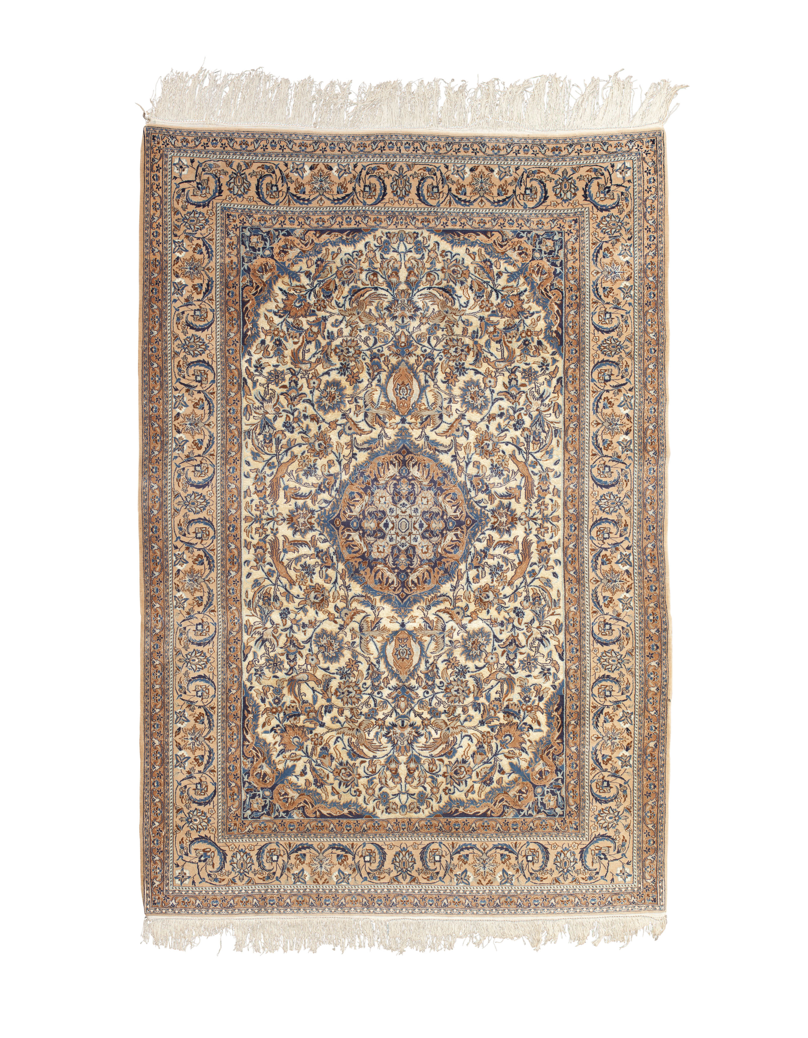 the cream field with blue and light brown medallion, similar spandrels, within beige palmette and foliate vine border between bands