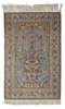 the light blue mihrab with vase of flowers surrounded by birds, cream spandrels, within cream bird cartouche and foliate vine border between bands, inscription to lower end