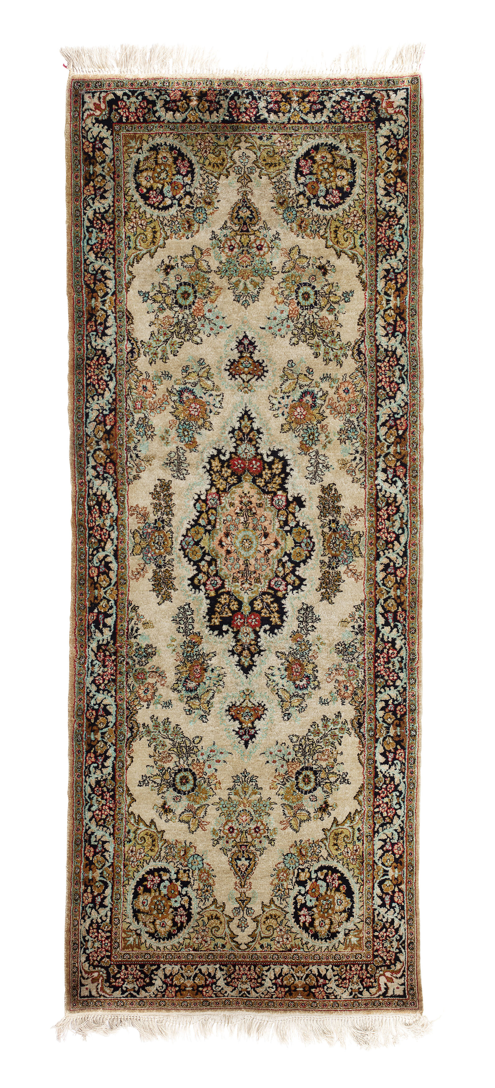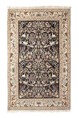 the indigo field with birds and animals amidst foliage, within similar cream border between bands; and a SHORT RUNNER, the cream field with indigo foliate medallion, similar spandrels, within indigo foliate border between bands (2)