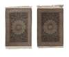 each with dark indigo field with large radiating beige medallion, within beige double S scroll border between bands, inscription to one end (2)