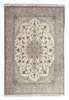 the cream field with radiating beige medallion, similar spandrels, within grey palmette and foliate vine border between bands, inscription to one end