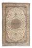 the cream field with radiating blue and light brown medallion, beige and pistachio spandrels, within beige cartouche and foliate vine border between bands, signature to one end