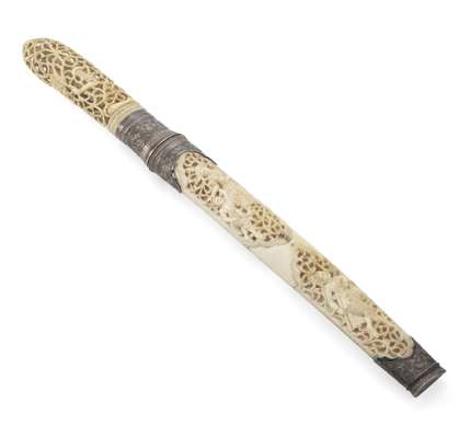 the handle pierced and carved with a kneeling figure to the interior and foliate scrolls, the scabbard with figural cartouches with metal mounts