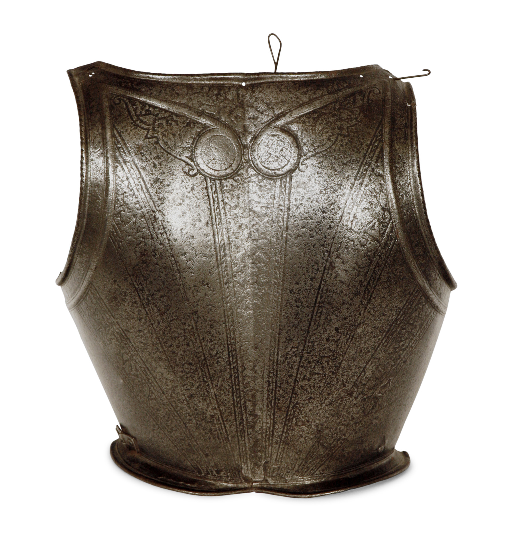 with two mask heads set in roundels on shaped back, six panels of etched foliate decoration.