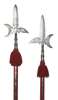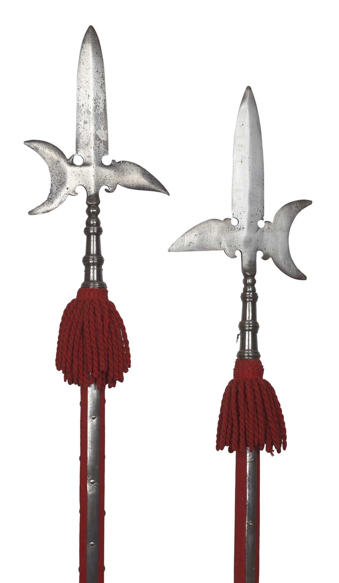 with crescent shaped blades of traditional form, with triple turned knops on the mounts, with long straps recovered in red velvet, octagonal hafts with tassel tops (2)