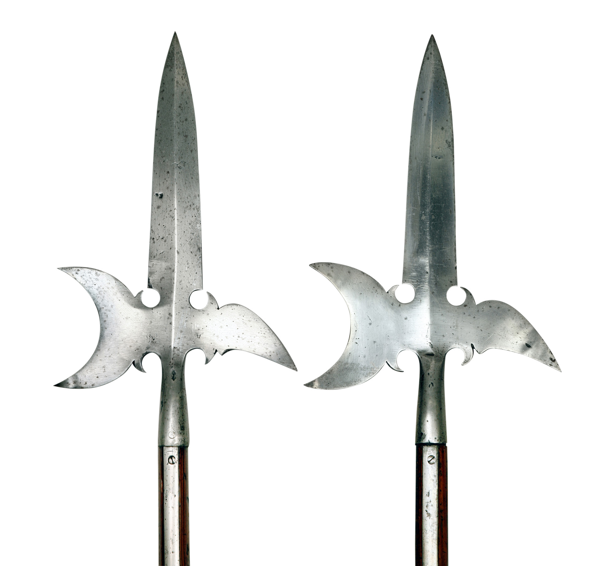 with traditional blades, crescent shape, outer and spear shaped top blade, long haft straps on shortened wood hafts (3)