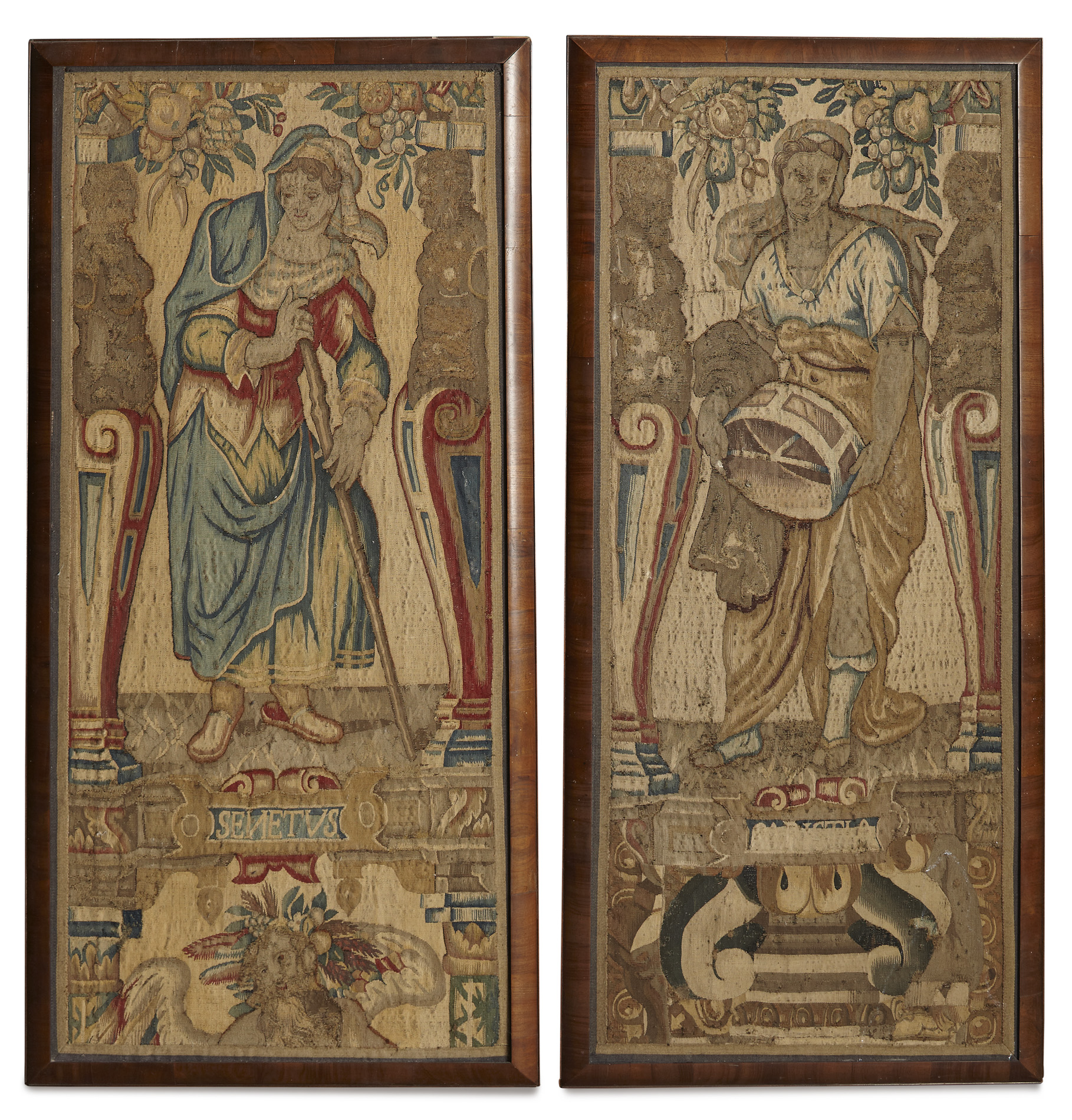 each depicting an allegorical female standing between terms bearing fruiting capitals, one with the inscribed panel 'ARISTIA', the other 'SENETVS', mounted and framed (2)