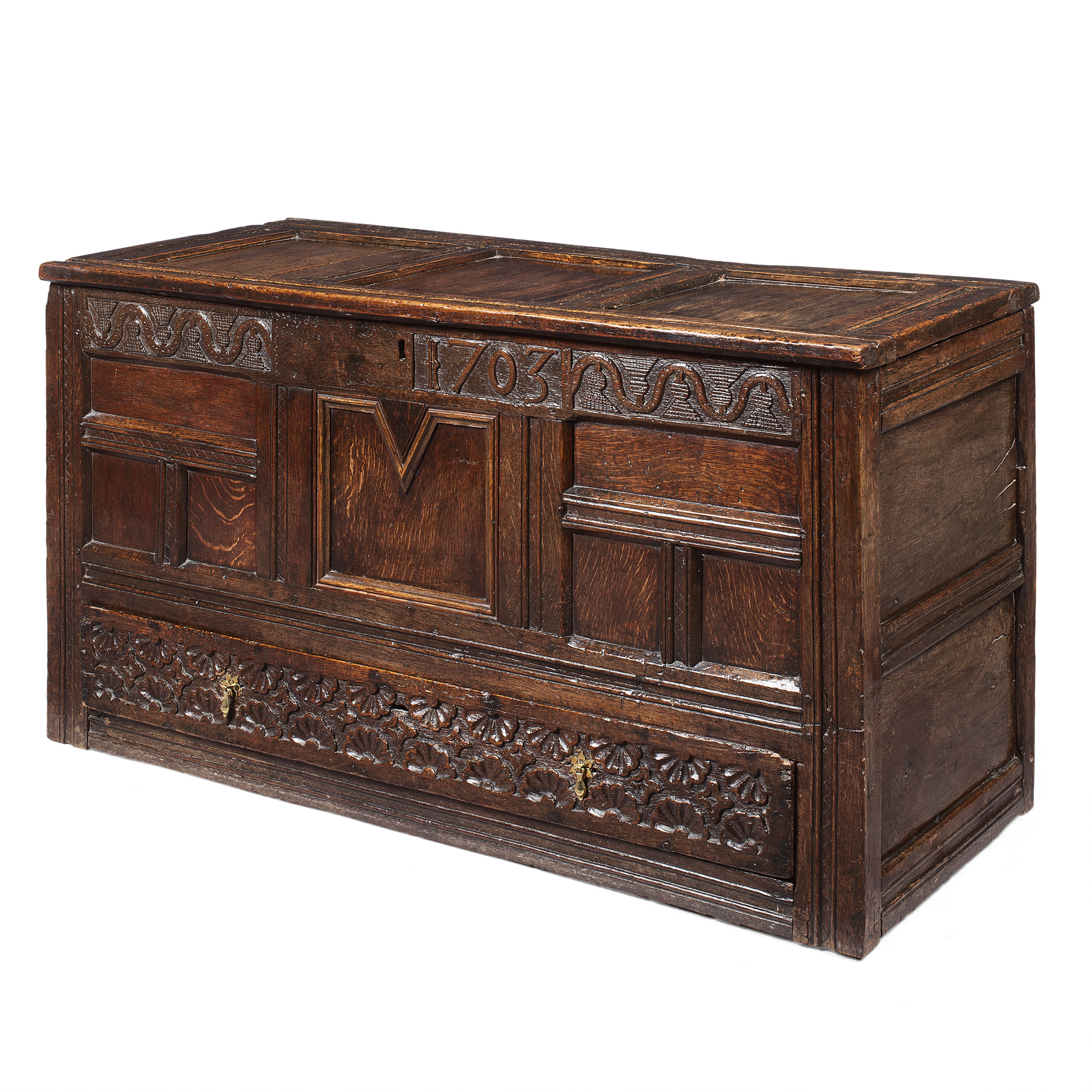 the triple panel hinged top over a panel front carved with thistles and dated 1703, over a foliate carved long drawer, the feet lacking