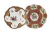 comprising a Derby dish decorated with fruit, flowers and vegetables within a wine red shaped border with gilt details, 19cm diam; and a Chelsea dish centrally decorated with a reserve of fruit and flowers within a lobed rim with reserves decorated with birds against a puce ground with gilt details, gilt anchor mark, 22cm diam (2)