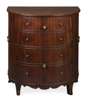 the demilune top with a moulded edge over two pairs of cupboard doors with false drawer moulded fronts opening to shelves, the sides mounted with brass bail handles, above a shaped apron raised on short splayed feet