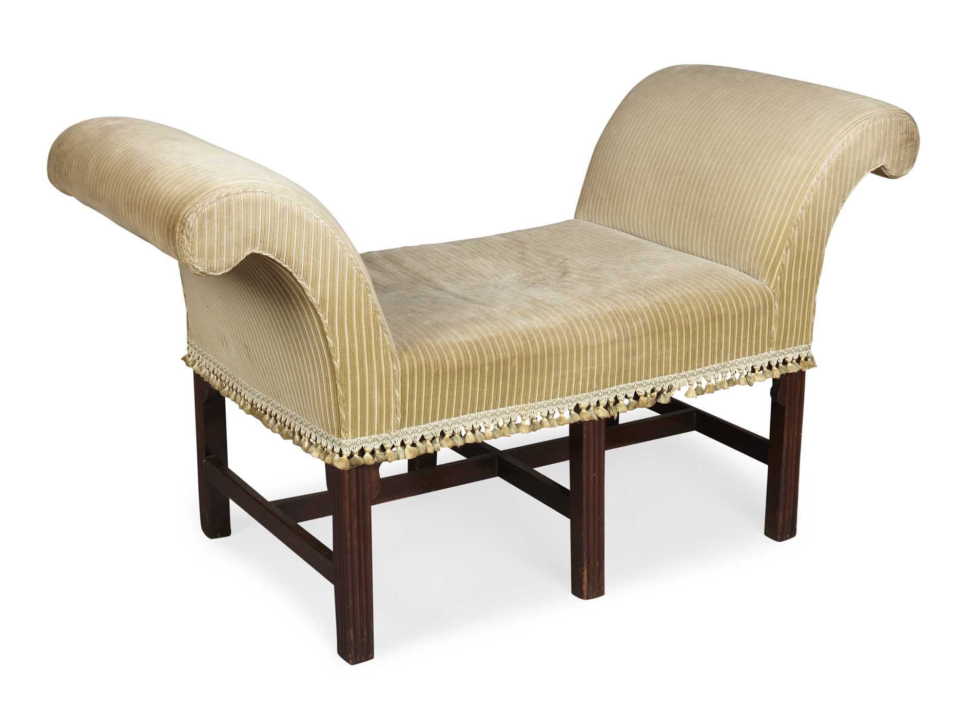 the high scroll arms above a padded seat raised on reeded square legs united by a cross stretcher