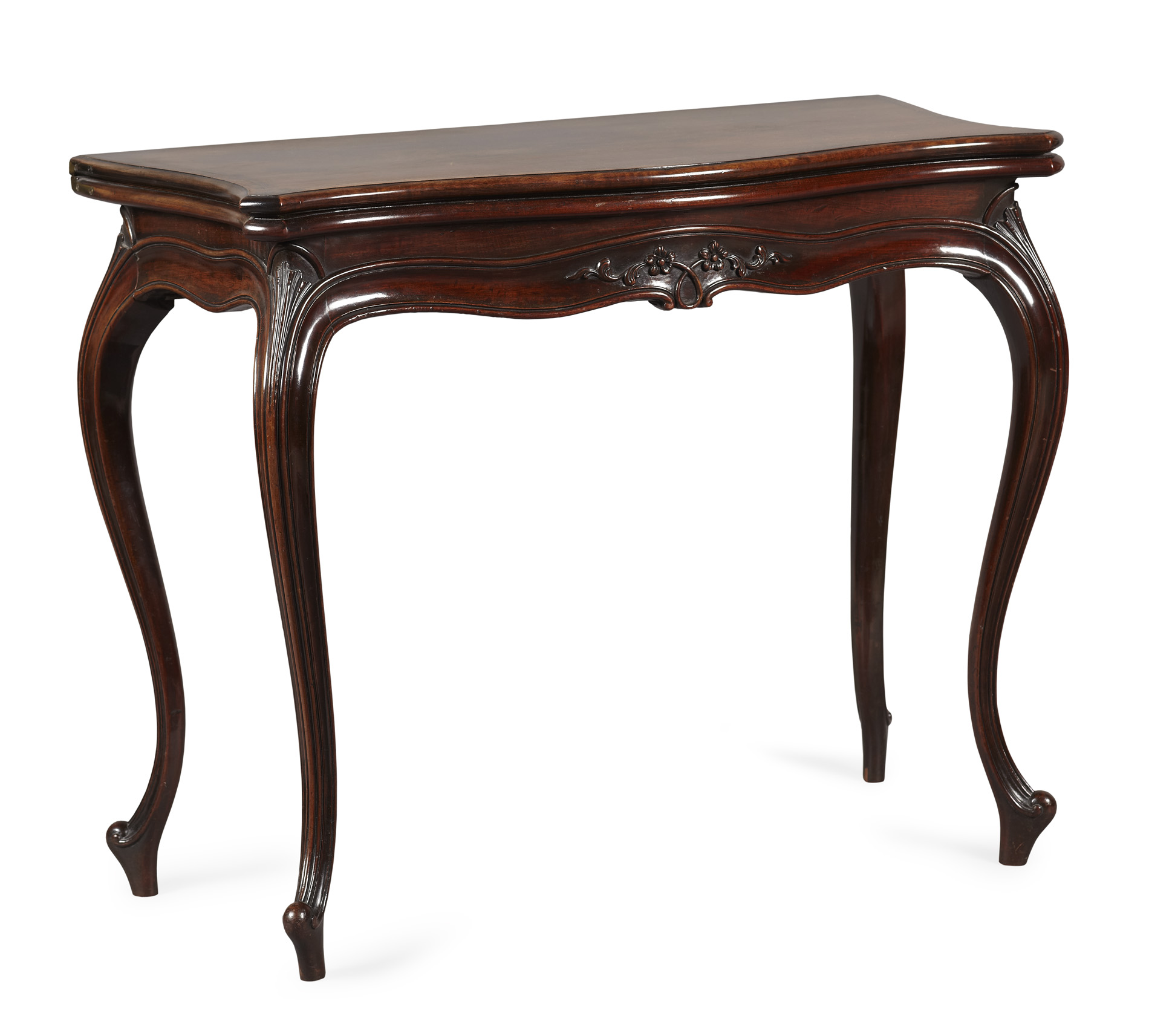in the French Hepplewhite style, the top with checquer banding opening to a green baize playing surface above a flower carved frieze raised on shell-carved slender cabriole legs ending in scroll feet