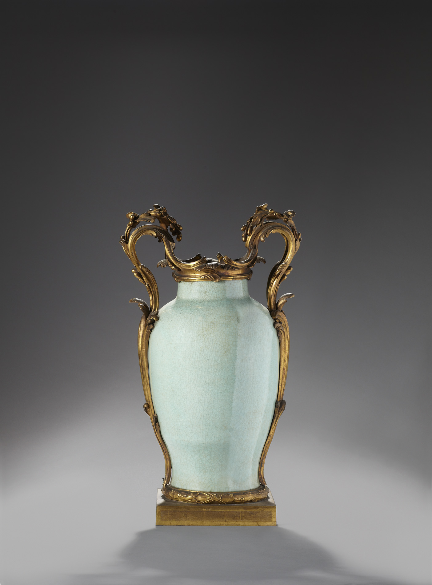 CHINESE CELADON CRACKLE GLAZE AND GILT BRONZE MOUNTED VASE